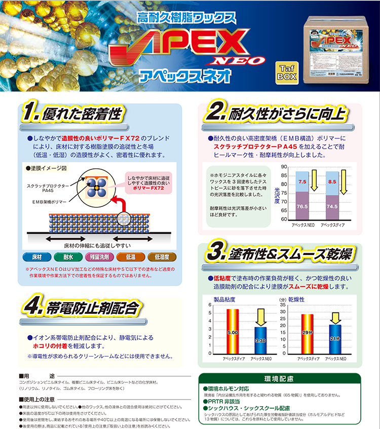 | 18L | 1,200㎡~1,800㎡(1回塗り)/18L | 8.7(25℃) | 約3.3 (mP・s、25℃) | 約22 (wt%、105℃/4時間) | 水 アクリル系樹脂エマルション 高融点ポリエチレンワックスエマルション 可塑剤 アルカリ可溶性樹脂 帯電防止剤 レベリング剤 防腐剤 消泡剤 |