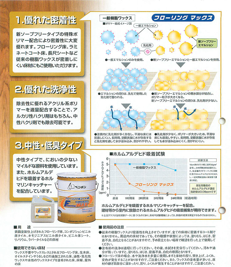 従来の樹脂ワックスが密着しにくい床材にもご使用いただけます。
