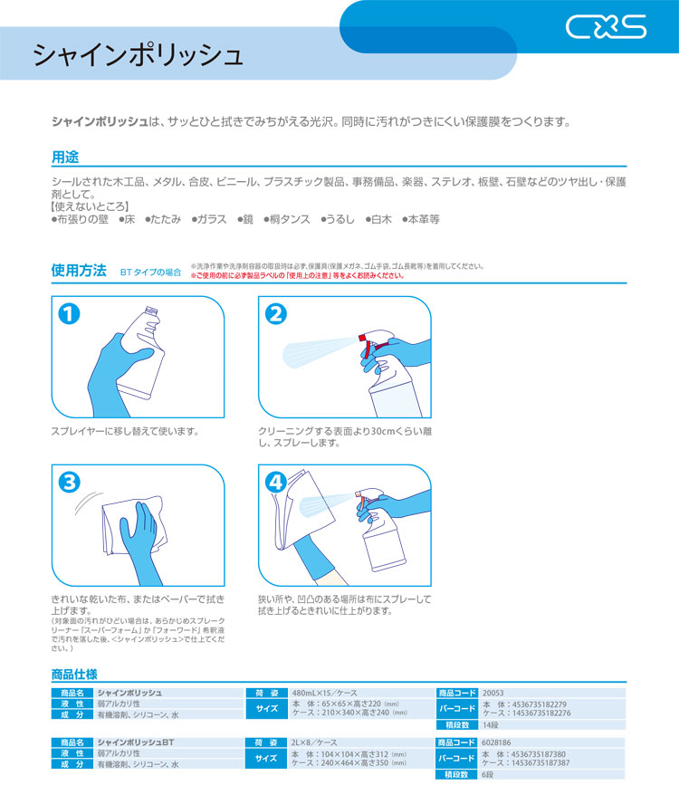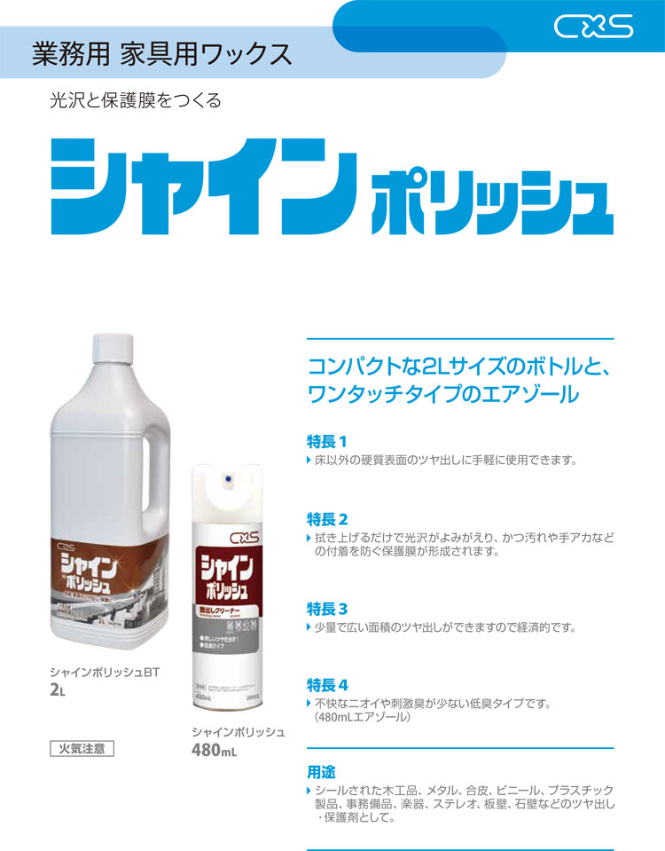 スプレーして拭き取るだけで、事務器具・備品のツヤを出し保護します。ワンランク上の輝きが得られます。