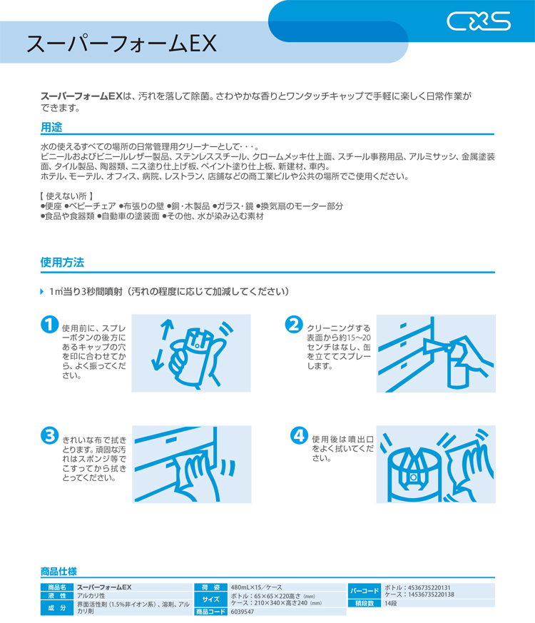 真っ白な泡が汚れを包み、軽く拭き取るだけで素早くクリーニング。除菌剤配合で衛生的。しかも柑橘系の香りが漂い、とてもさわやかです。ビニールレザーの汚れ落しに最適。水の使える場所に幅広く使えます。