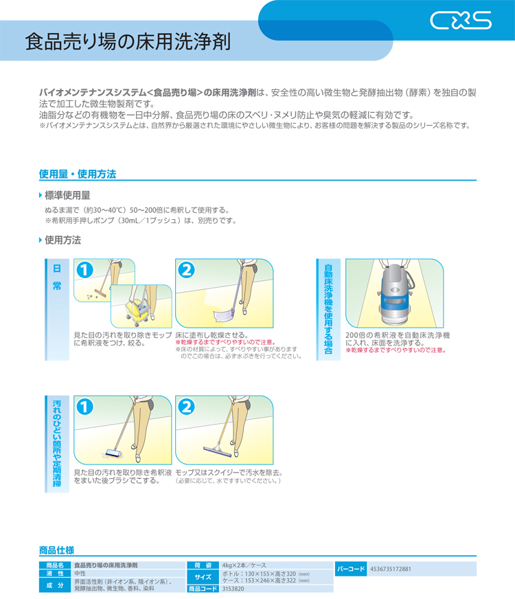 安全性の高い微生物と発酵抽出物(酵素)を独自の製法で加工した、微生物製剤です。油脂分などの有機物を一日中分解。食品売り場の床の滑り、ヌメリ防止や臭気の低減に有効です。