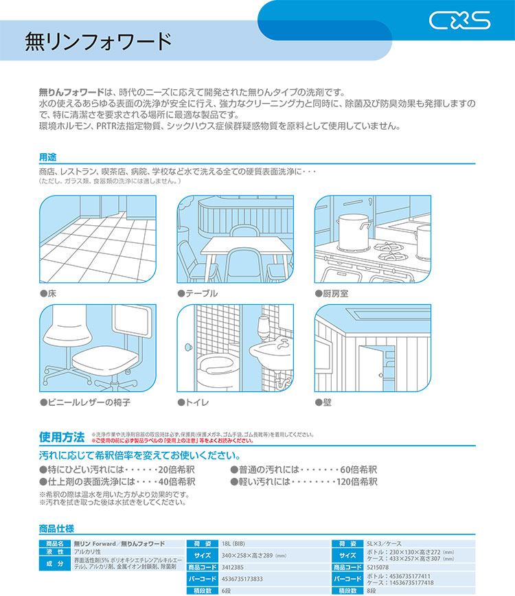 | 18L | 特にひどい汚れには20倍希釈仕上げ剤の表面洗浄には40倍希釈普通の汚れには60 倍希釈軽い汚れには120倍希釈 | 13以上(@25℃) | 約4.3(mPa・s、@25℃) | 水、非イオン活性剤、陽イオン活性剤(除菌剤)、珪酸塩(緩衝剤)、キレート化合物(金属封鎖剤)、染料、香料 |