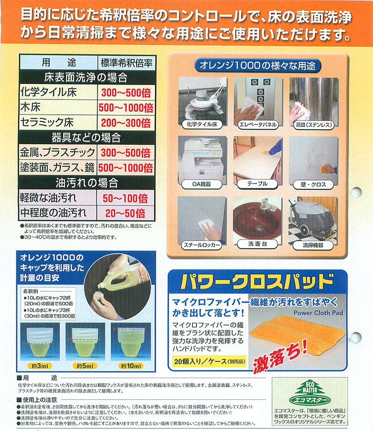 | 800ml | 20倍~1000倍 | 2400㎡(300倍希釈時) | 7.5(25℃) | 約70 (mP・s、25℃) | 水 非イオン系界面活性剤 グリコール系溶剤 有機酸塩 オレンジオイル 防腐剤 染料 |