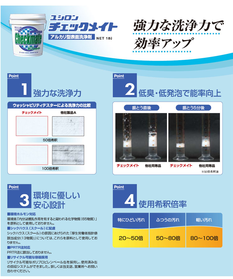 強力な洗浄力の汎用表面洗浄剤です。強力な洗浄力で、洗浄作業の効率アップを図れます。低臭・低発泡タイプのため作業が楽に行えます。環境に優しい安心設計で、PRTR法対応品です。