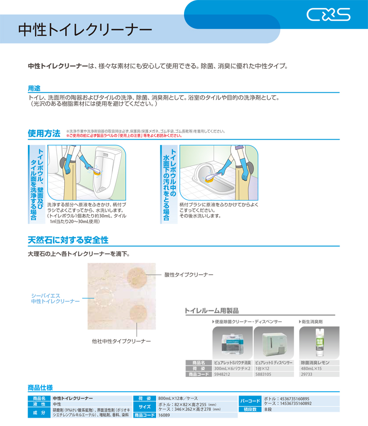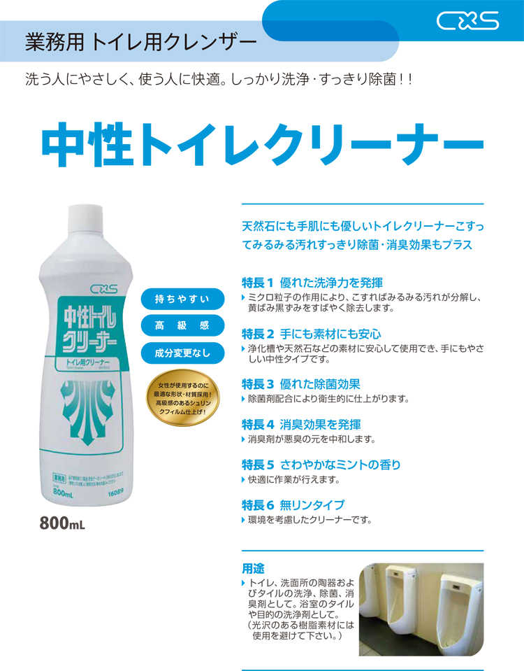 | 800ml | トイレボウルには、一個1回当たり30 mL、タイル1㎡当たり 20 ~ 30 mL使用 | 7.4 | 3,000mPa・s(BM型回転粘度計) | 非イオン系界面活性剤 研磨材 増粘剤 除菌剤 香料 染料br />水 |