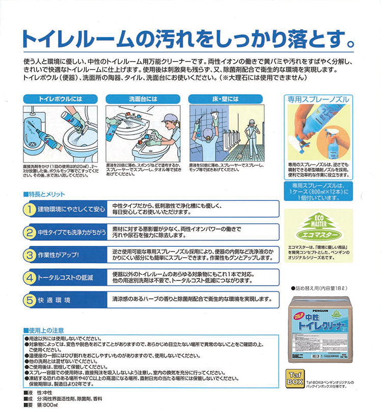 使う人と環境に優しい、中性のトイレルーム用万能クリーナーです。