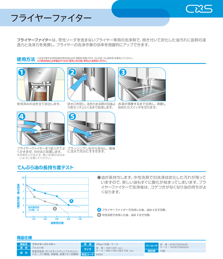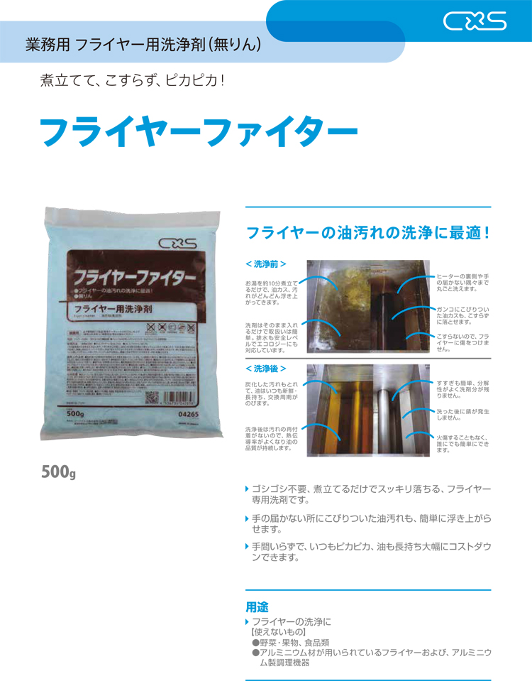 油槽内のすみずみにこびりついた油汚れ、油かすを煮立てるだけでスッキリ落とせるフライヤー専用洗剤です。