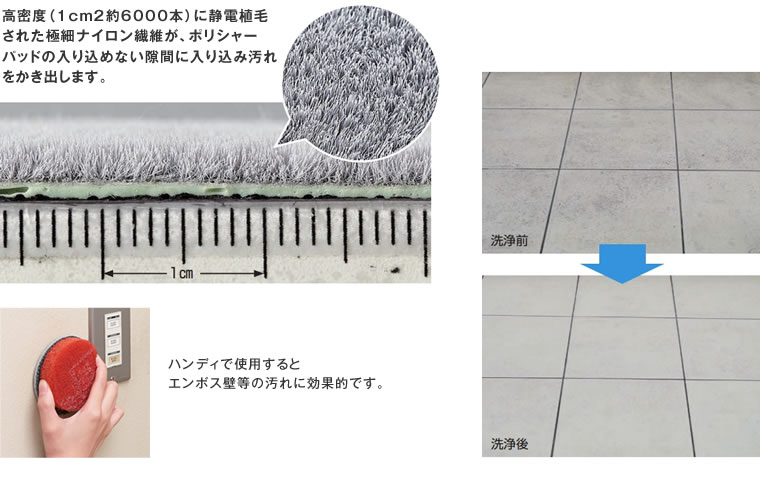 高密度に静電植毛された極細ナイロン繊維が、ポリシャーパットの入り込めない隙間に入り込み汚れをかきだします。
