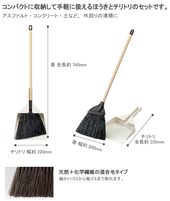| ほうき幅約200 全長約740 チリトリ幅 約220×335mm (グリップ含む) | ほうき約220(g) チリトリ約130(g) | 約140(mm) | ほうき/ハンドル:スチールパイプ、 甲:PP、毛:PP50%・アレンファイバー50%、 チリトリ/PP |