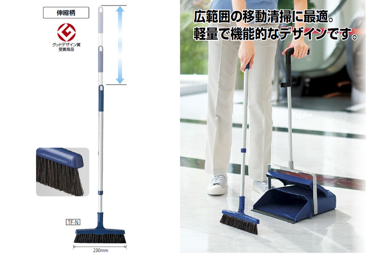 駅や商業施設など広範囲の移動清掃に最適。軽量で機能的なデザインの箒です。