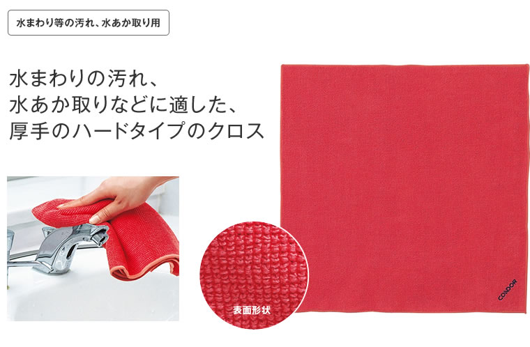 水まわりの汚れ、水アカ取りなどに適した、厚手のハードタイプのマイクロファイバークロスです。