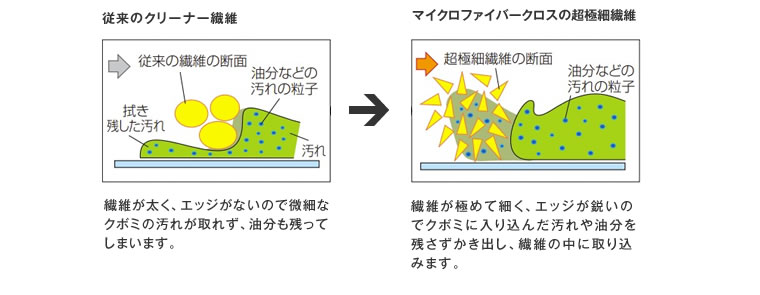 鋭いエッジを持つ、多角形断面の超極細繊維が、クボミに入り込んだミクロの汚れまで残さずかき取り、汚れを完全吸着します。