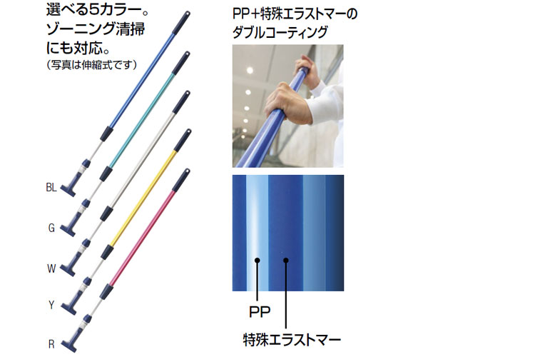 | 材質 | ハンドル/スチールパイプ(φ25mm)樹脂被覆、アルミパイプ(φ22mm) ヘッド/PP グリップ/PE 伸縮ストッパー/ABS |