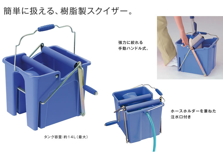 簡単に扱える樹脂製スクイザーです。ホースホルダーを兼ねた注水口付きです。