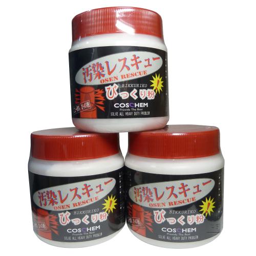 汚染レスキュー!びっくり粉!手っ取り早く汚れを落としたい方。明らかな洗浄効果を出したい方。液体洗剤では汚れが落ちない方など、ここ一番はびっくり粉です。びっくり粉は汚れを落とす原理の「溶かす・はがす・ぼかす・削る」の中で特に「削る」に特化したケミカルです。液体洗剤の溶解作用や浸透作用に要する時間をカットし、即座に洗浄効果を発揮します。また、超微粒子の粉をその汚染状況に応じて水と混ぜ合わせるだけで、床面から立面まで、あらゆる用途で素早く効果を発揮します。柔らかく溶けやすい特殊シリカを超微粒子にて配合し、汚染物で形成された凹凸の汚染物のみを削り取ります。また、その特殊シリカの形状から洗浄面に傷をつけにくい性質も兼ね備え困った時に、役立つ汚染レスキューと呼べるでしょう。水アカ、石鹸カス、ウロコ等の除去に最適です。