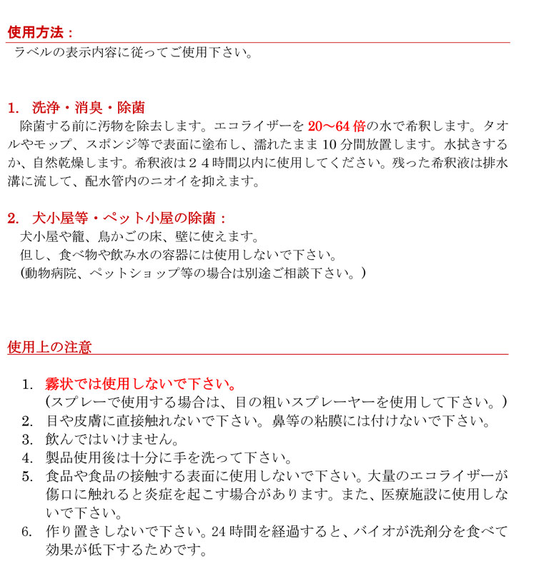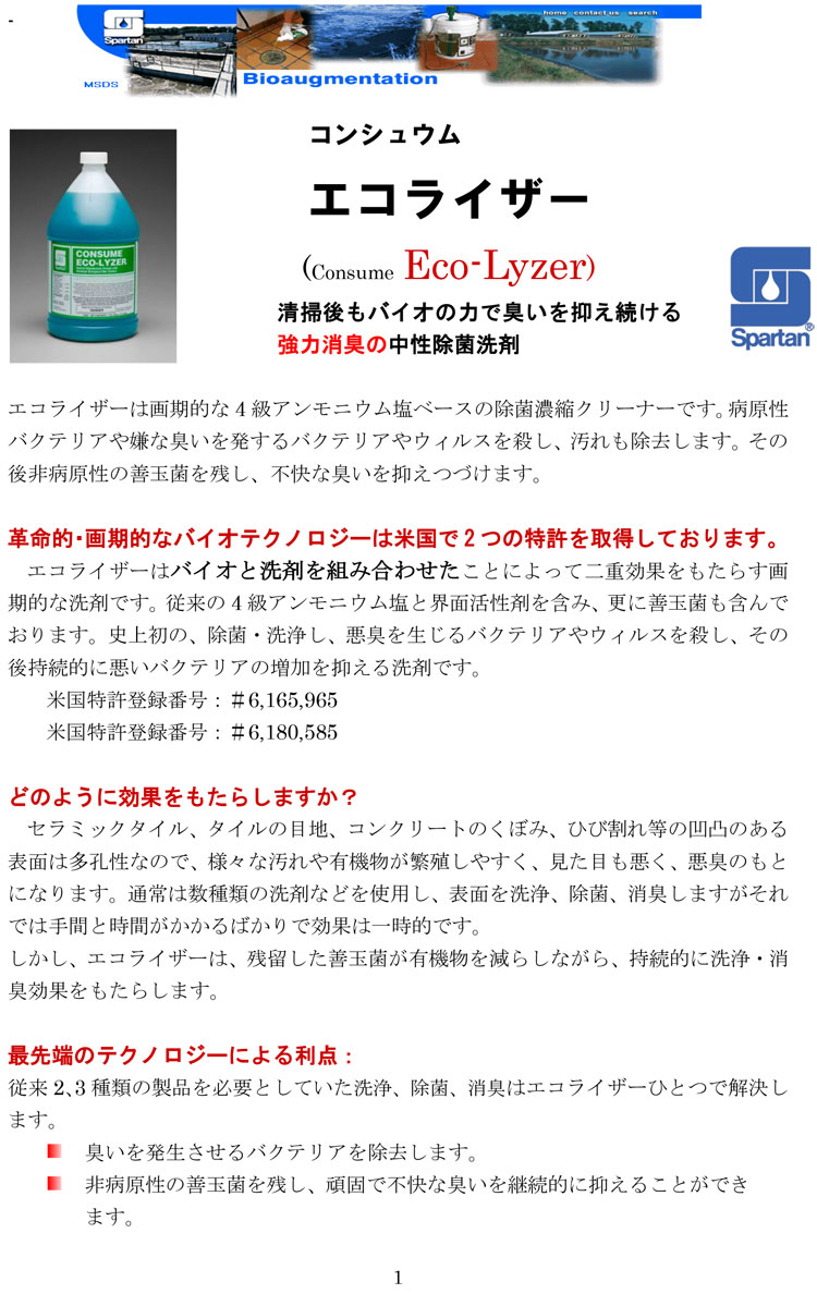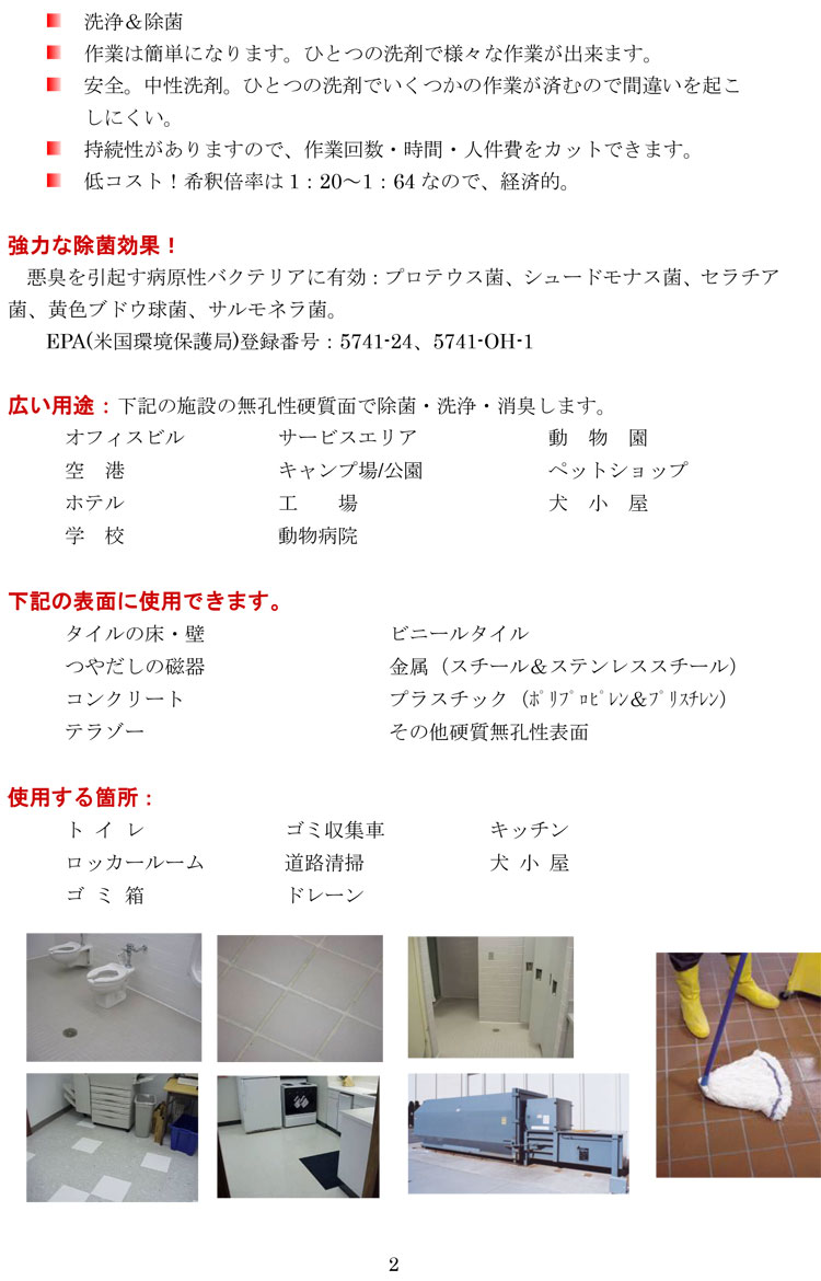 画期的な非病原性のバクテリア入り洗剤です。第四級アンモニウム塩ベースの防感染洗剤です。持続的に生活の悪臭をコントロールします。ゴミ置き場、トイレの床、ペットの臭い、ロッカー等幅広い用途。pH:6.5~7.5、希釈倍率:20~64倍