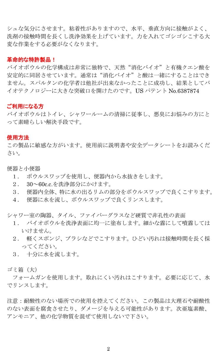天然酸配合、バクテリア入り洗剤です。大小便器の尿石、水垢、石鹸カスの除去に高効果。持続的に威力を発揮します。pH:1.5~2.5、希釈倍率:原液