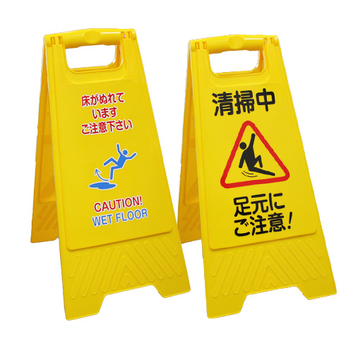 片面は床清掃時に転倒注意を呼びかける「床がぬれていますご注意下さい」のサイン。
