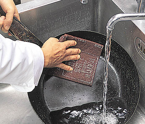 鍋・釜等の調理器具の洗浄、たわしを水で湿らせ、汚れをこすり落として下さい。