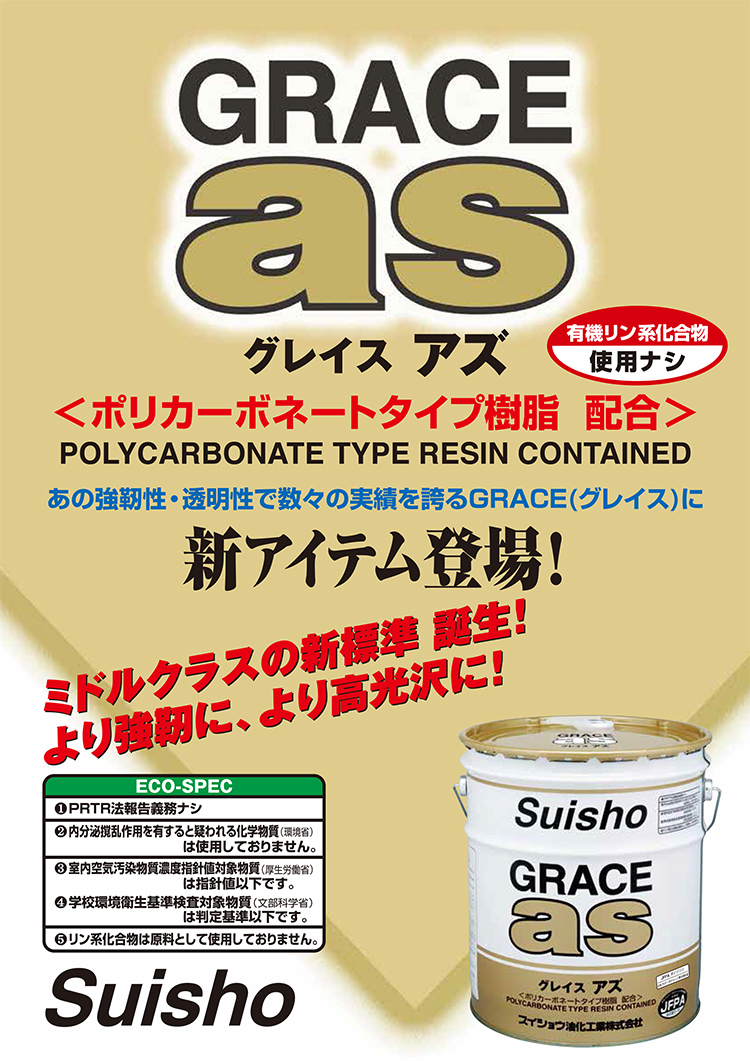 | 18L | 1,000~1,300m2/18L | 7.5 ±1.0(25℃) | 約5.5±2.0 (mP・s、25℃) | 約25±2 (wt%、105℃/4時間) | 水 金属架橋型アクリル系コポリマー ポリカーボネートタイプ樹脂 ポリオレフィンワックス アルカリ可溶性樹脂 可塑剤(非リン系) 融合剤(カルビトール系) レベリング助剤(フッ素系) 消泡剤、他 |