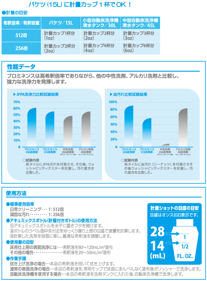 | 2L、946ml | 日常クリーニング512倍頑固な汚れ 256倍 | 7.4(256倍希釈時)7.0(512倍希釈時)(@25℃) | 約79.5(mPa・s、@25℃) | 水、非イオン系界面活性剤、金属封鎖剤、脂肪酸、脂肪酸、香料、防腐剤 |