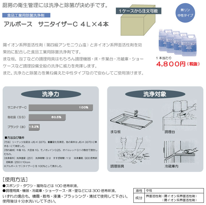 陽イオン系界面活性剤と非イオン系界面活性剤を効果的に配合した食品工業用除菌洗浄剤です。