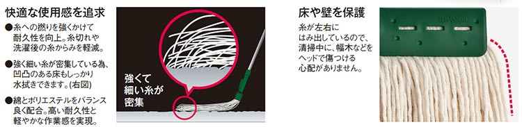 芯材が糸の根元にセットされたことで、押さえた力がモップ糸に伝わり、凹凸のある床もしっかり水拭きできます。