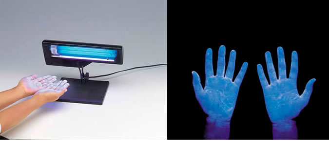 ローションを手についた汚れに見立てて、「スタンド型手洗いチェッカーBLB」にて特殊ライト下で光らせます。 適切な手洗いが実施できているか確認できます。