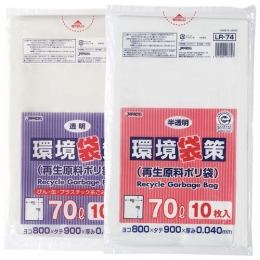 | 環境袋策 70L | 透明 | LR-73 | W800×H900(mm) | 再生LL | 0.04(mm) | 10枚×30冊=300枚 |