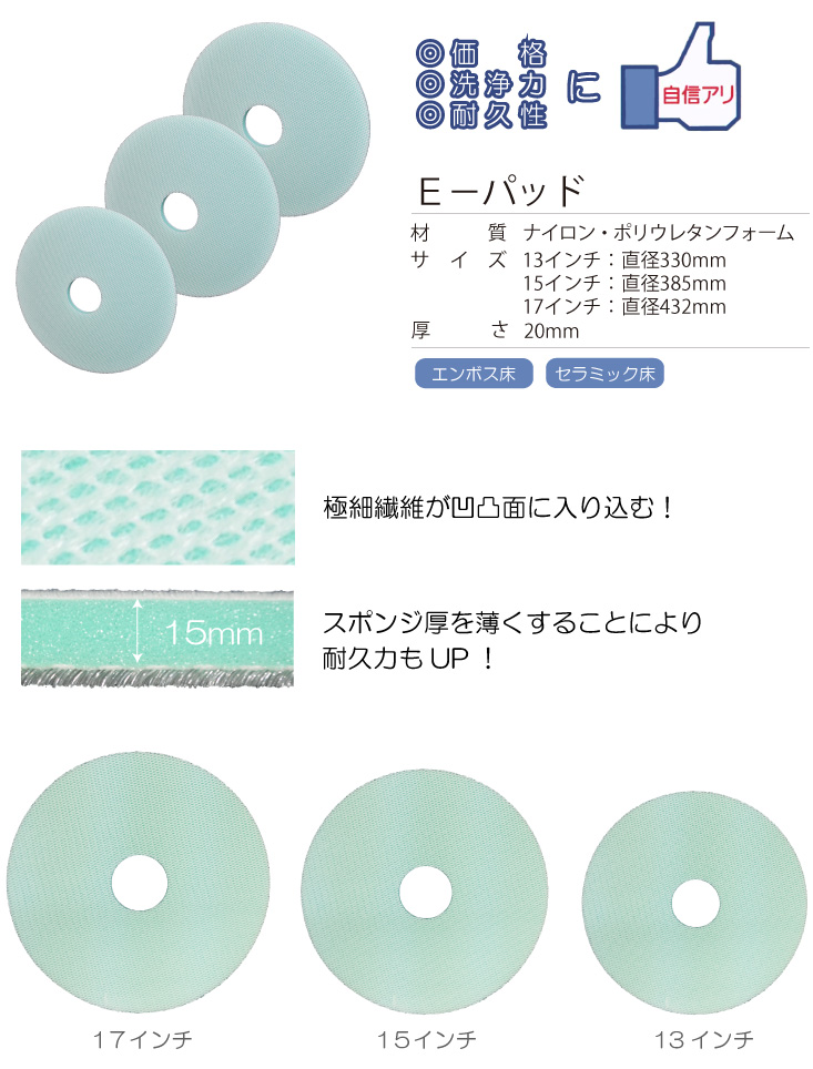 スポンジ厚を薄くすることにより耐久力もUP! 極細繊維が凹凸面に入り込み、エンボス床やセラミック床に最適なパッドです。