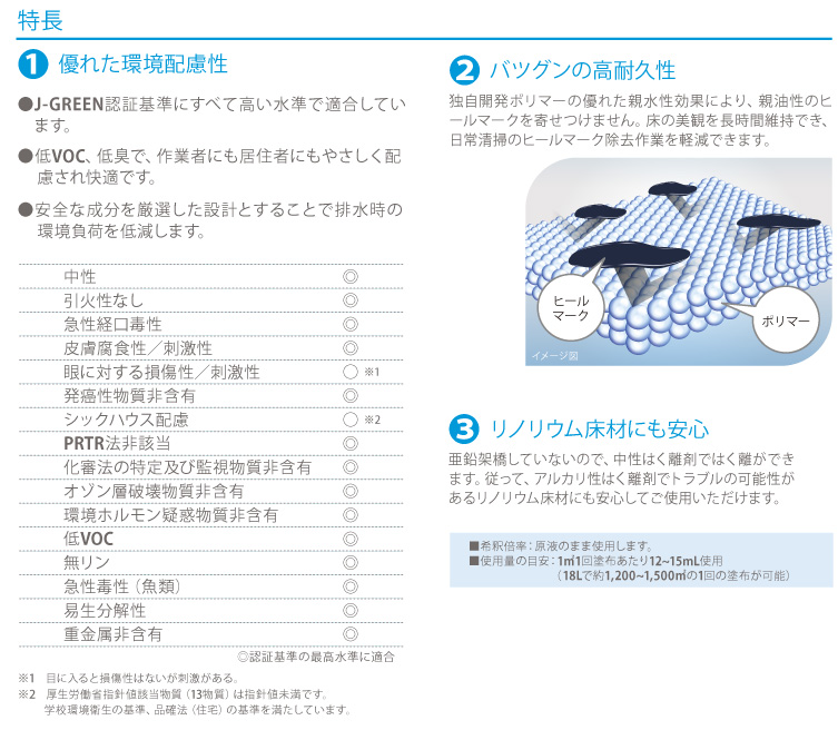 | 18L | (18Lで約1200m2の1回塗布が可能) | 約5.9(mPa・s、@25℃) | 約21.0(wt%) | 水、非金属架橋型アクリルコポリマー、高融点ポリエチレンワックス、可塑剤、皮膜形成助剤 、防腐剤、界面活性剤、消泡剤 |