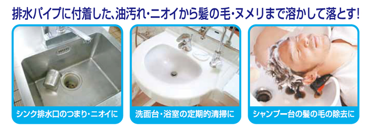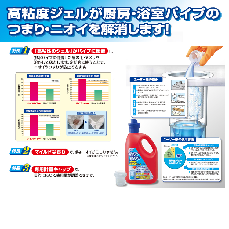 高粘度ジェルがピタッと密着して、ヌメリ・髪の毛を溶かすから、パイプ臭まで根本解決できます。