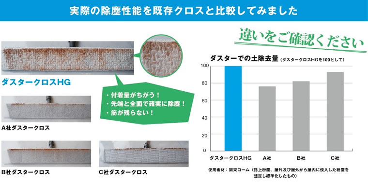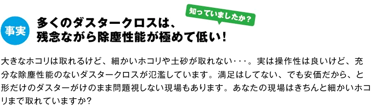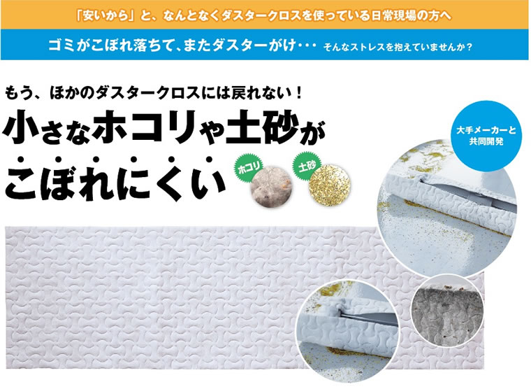 ●実際に使った最初は、正直、従来品との比較で作業性(少し操作が重い)は良くなかったです。しかし、毎日使用することでの慣れ、そして一番はダスター作業後のホコリ・土砂が目につかなくなっていることでした。作業性も重要ですが、ダスター作業本来の除塵性に優れたクロスと思います。