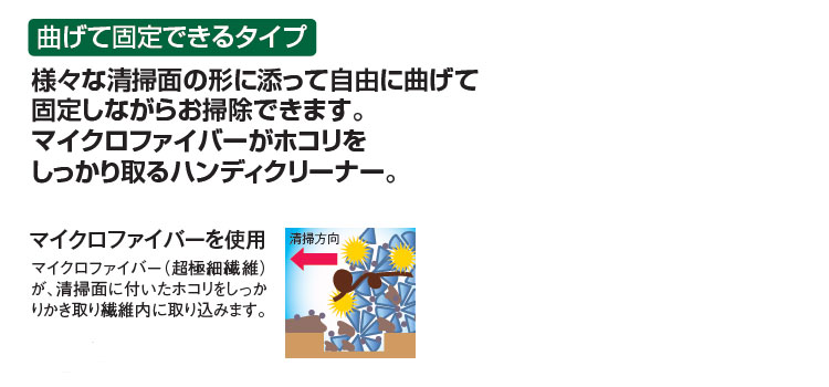 様々な清掃面の形に添って自由に曲げて固定しながらお掃除できます。
