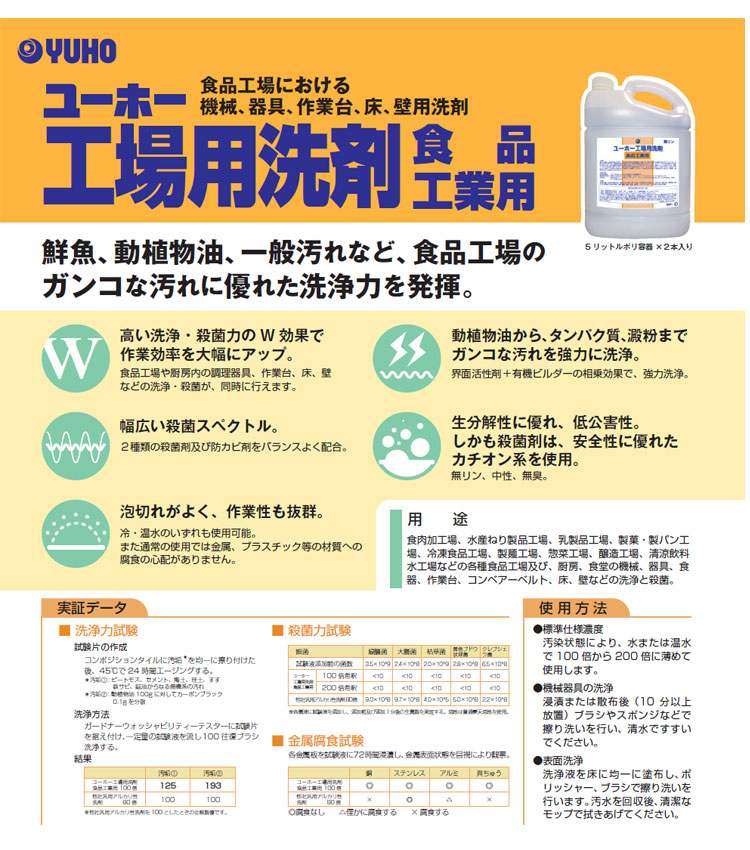 | 用途 | 食品工場や厨房の床、壁、機械などの洗浄と殺菌 |