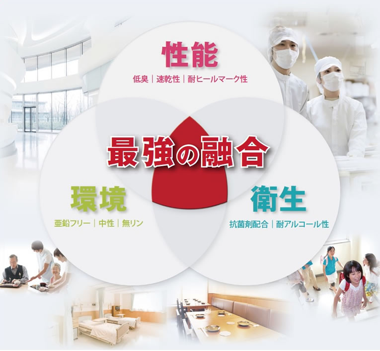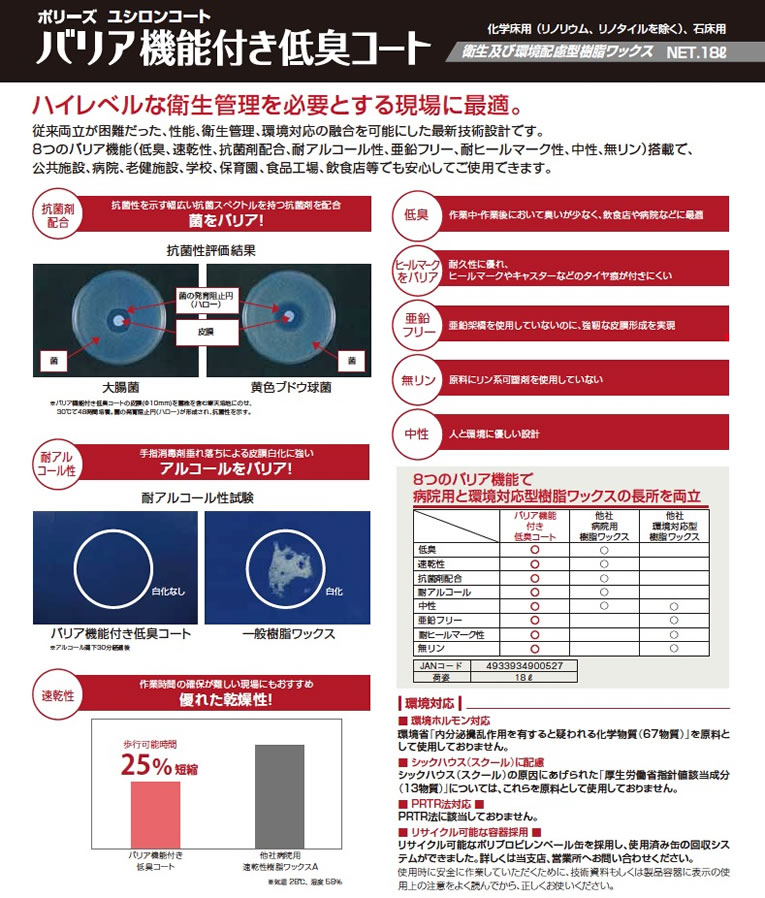 8つのバリア機能(低臭、速乾性、抗菌剤配合、耐アルコール性、亜鉛フリー、耐ヒールマーク性、中性、無リン)搭載で、公共施設、病院、老健施設、学校、保育園、食品工場、飲食店等でも安心してご使用できます。