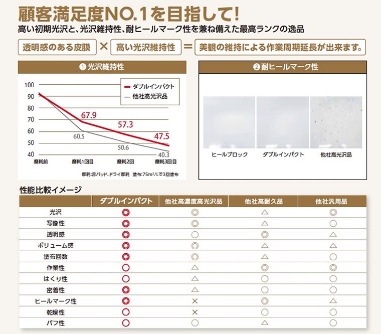 高い初期光沢と、光沢維持性、耐ヒールマーク性を兼ね備えた最高ランクの逸品