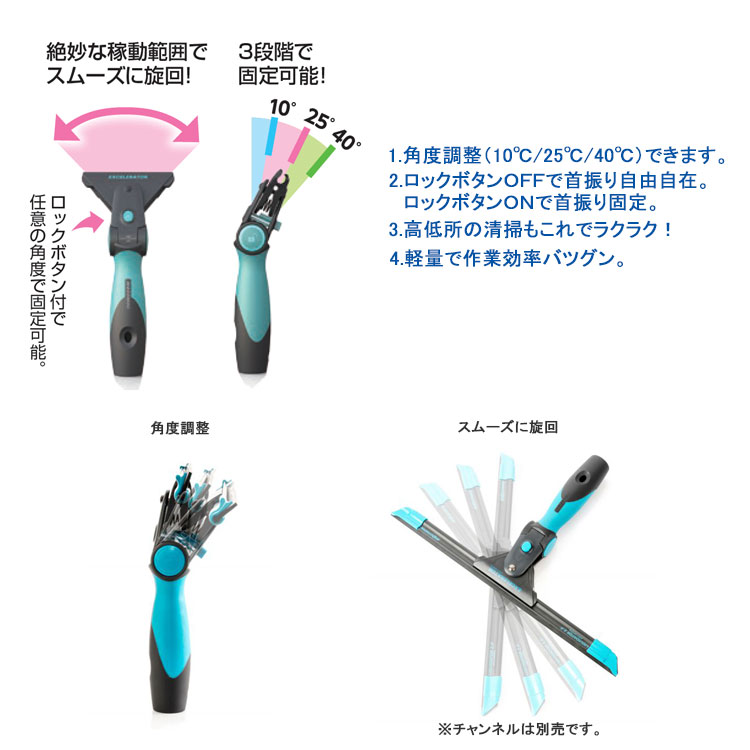クネクネと自由自在に首振りするヘッドが、手首の動きをしなやかにガラスに伝え、短時間でキレイに仕上げます。