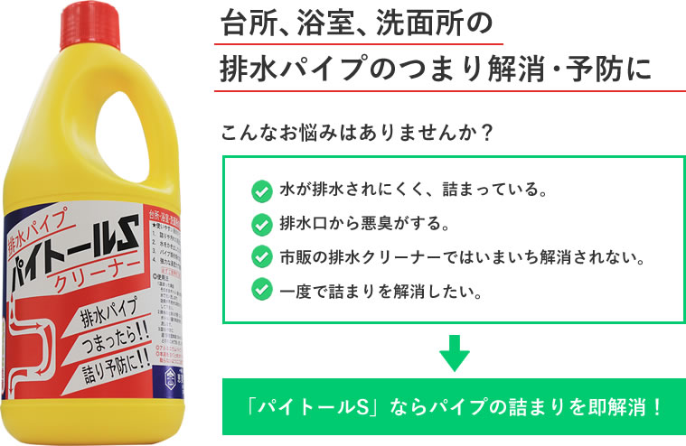 - 排水口にパイトールSをゆっくり500mlほど流し込んでください。