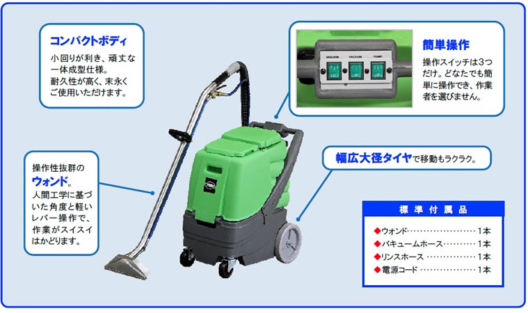 高圧噴射と強力バキュームで抜群の洗浄力。カーペット常温水濯ぎ洗い機(リンサー)