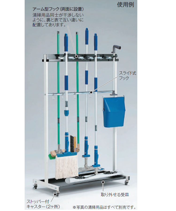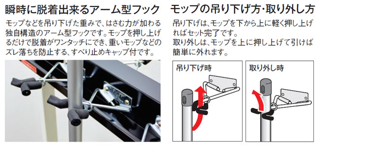 モップなどを簡単に脱着できるアーム型フックのタフなハンガー。