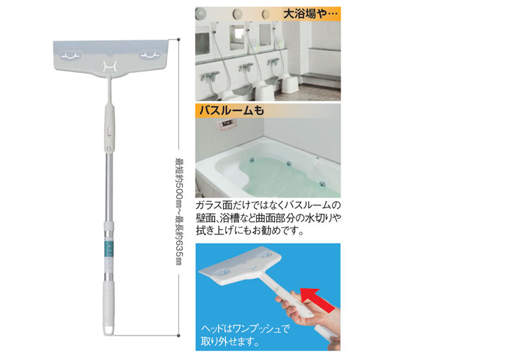 | 幅25㎝ | 170g | 本体:ポリプロピレン・POM樹脂、 ヘッド:ポリプロピレン・エラストマー、 柄:アルミパイプ(伸縮)、ジョイント:ポリプロピレン、 グリップ:ポリプロピレン | 伸縮:最短約500mm・ 最長約635mm |
