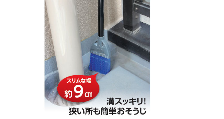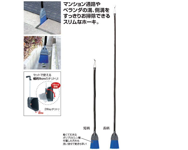 マンション通路やベランダの溝、側溝をすっきりお掃除できるスリムなホーキ。