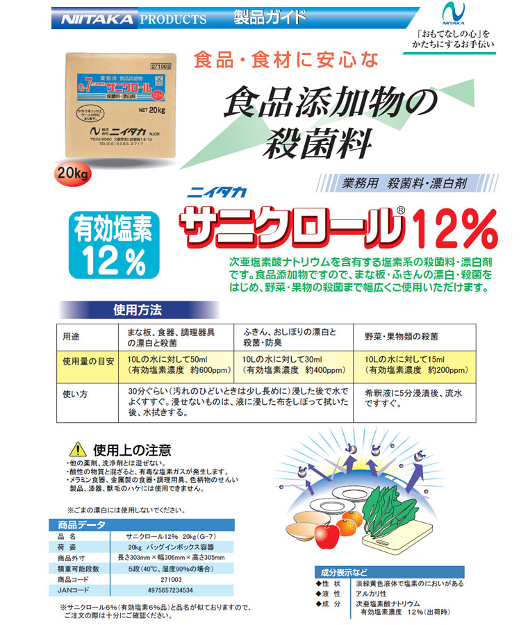 ニイタカ 殺菌料・漂白剤 サニクロール12% 20kg BIB【軽減税率対象品】