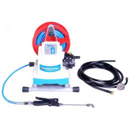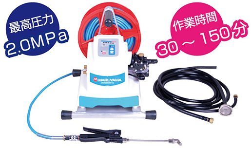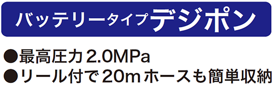 バッテリー式エアコン洗浄機。噴射時のみモーター駆動する静音タイプ。バッテリータイプデジポン。