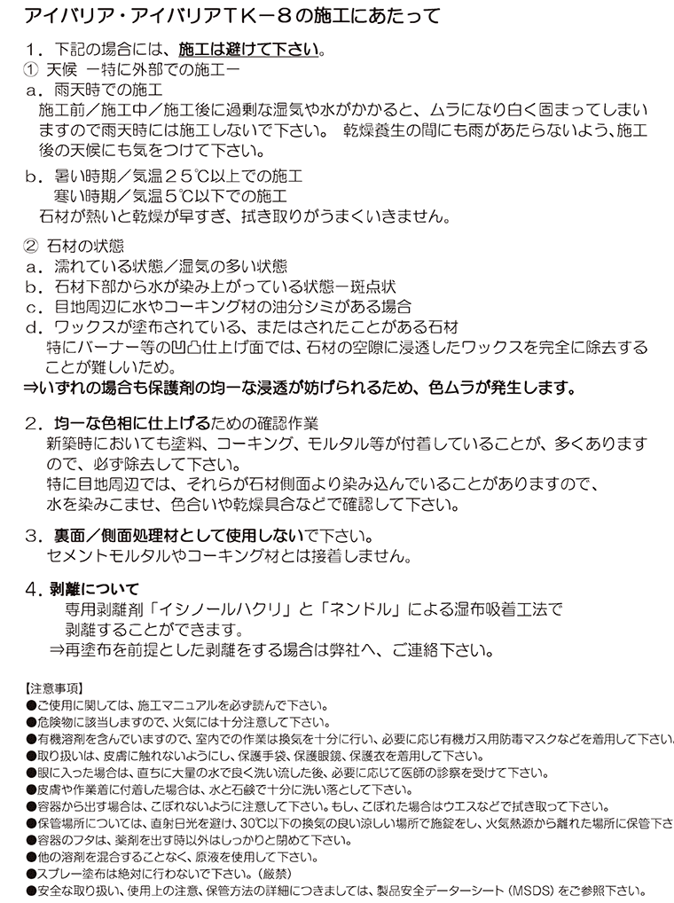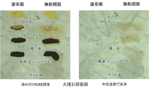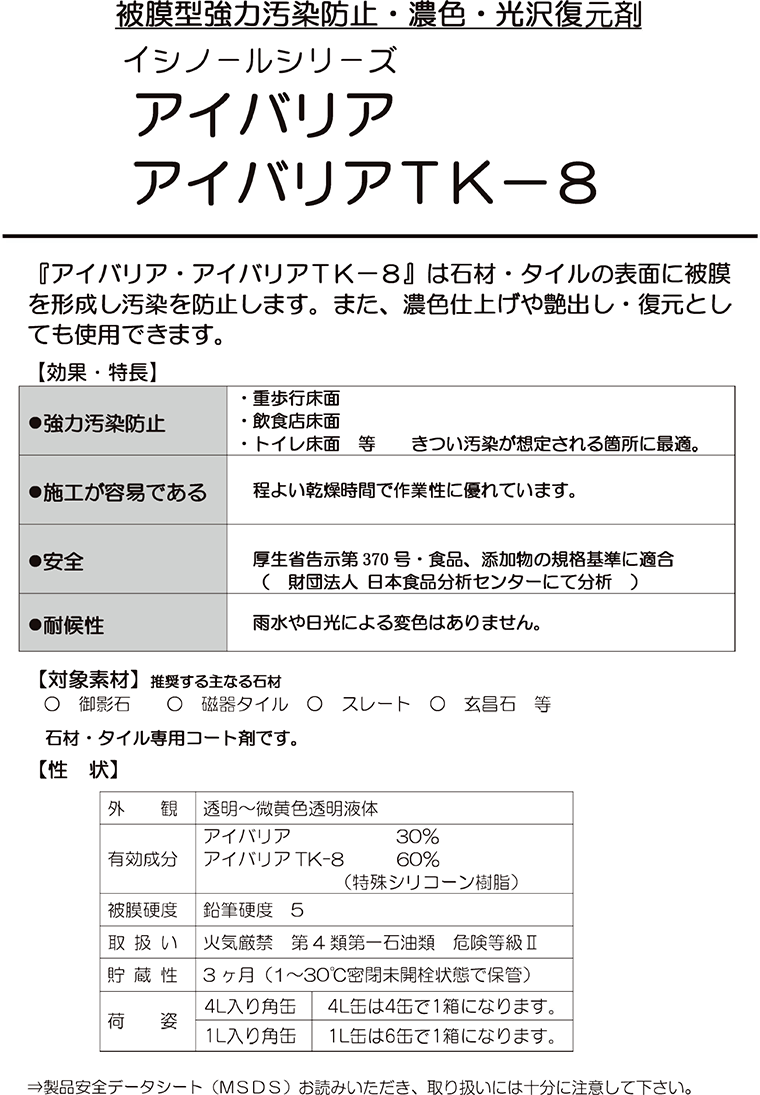 被膜タイプの石材用保護剤。 石材・磁器タイルの表面に硬い被膜を形成し、汚染を防止します。 重汚染の想定される箇所、また耐油性に優れて いますので飲食店や駐車場などの床に最適。 艶ボケの再生にも使用できます。