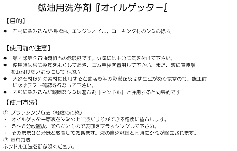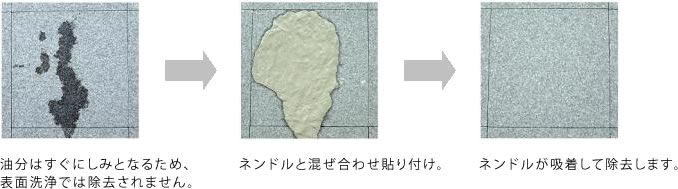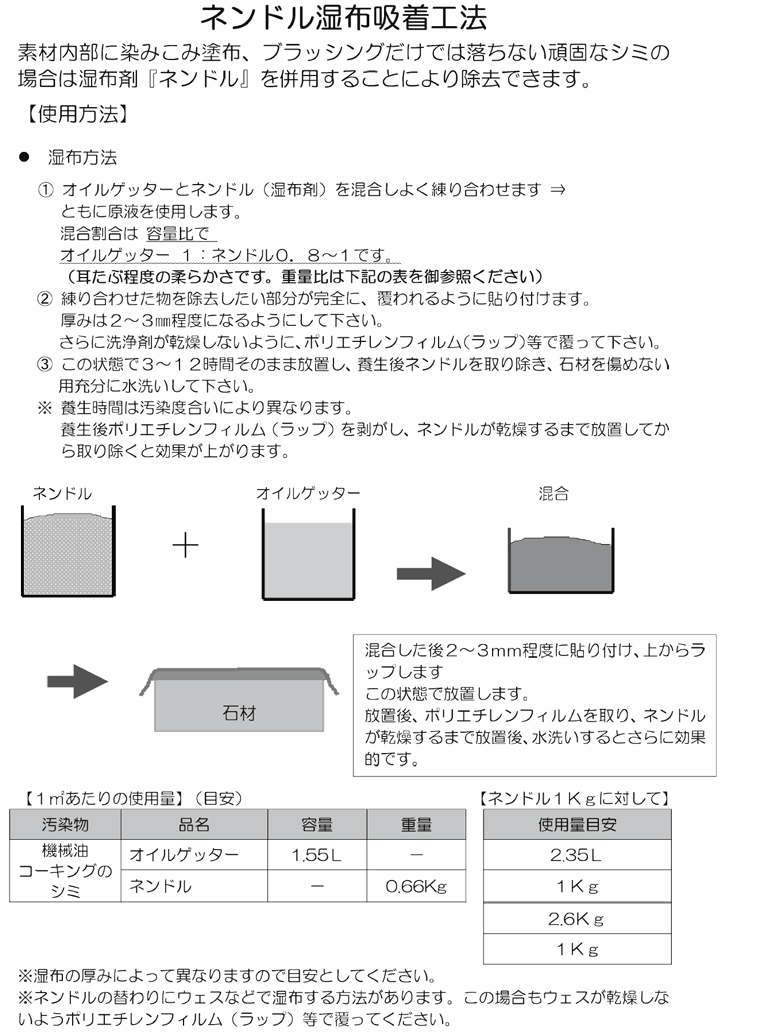 | 特長 | 大理石等全ての石材に使用できます。 ネンドルと併用することで、深いしみも除去できます。 |