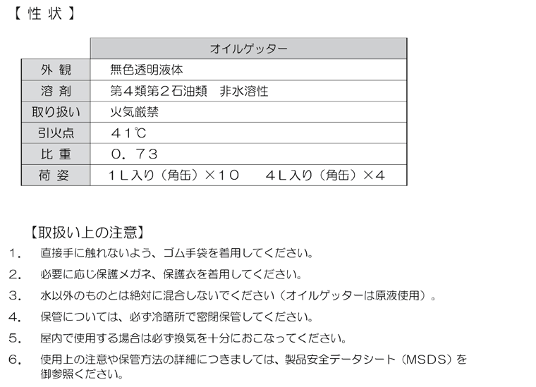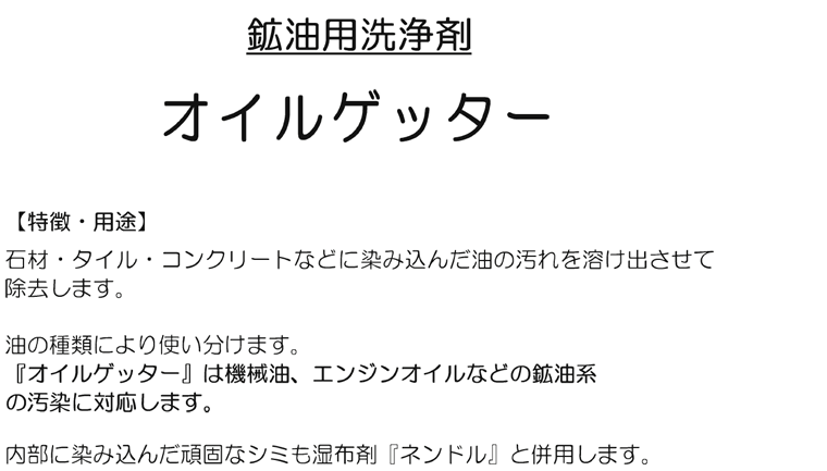 | 用途 | マシン油、エンジンオイル等の鉱物油の除去。 |