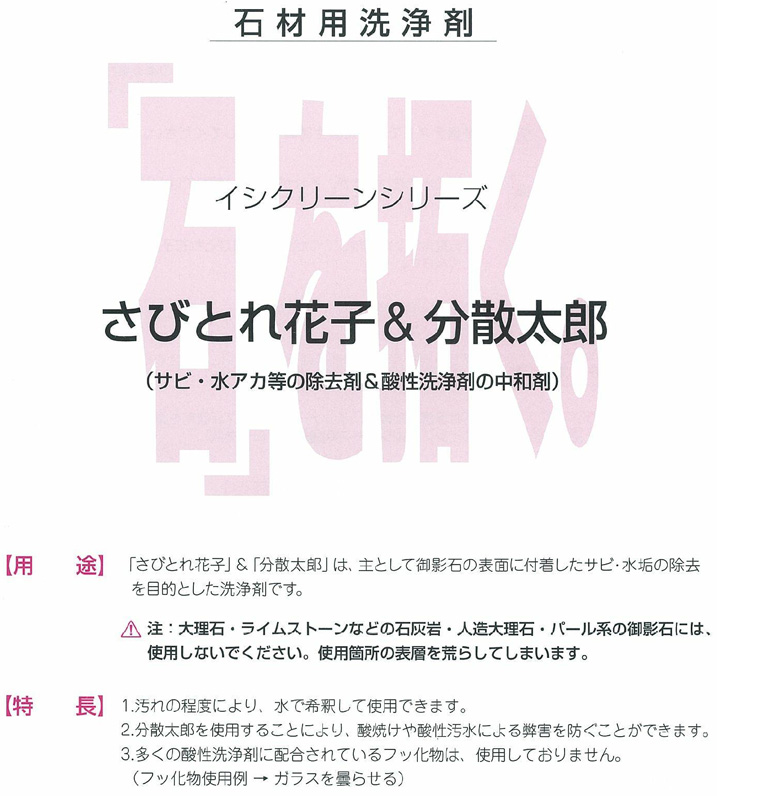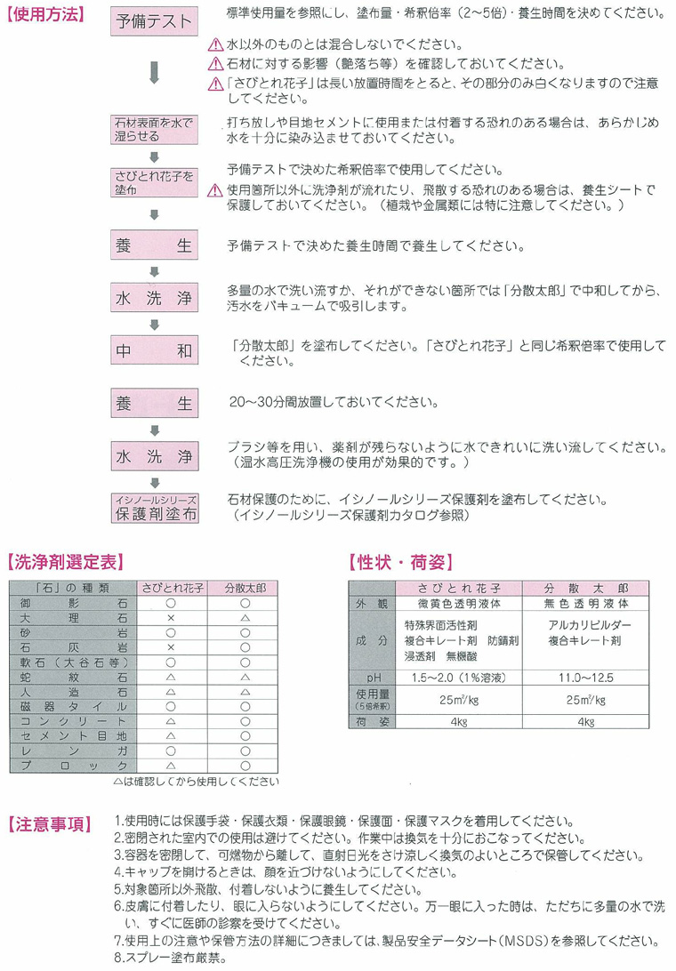 | 目的 | 御影石、タイル、レンガなどの表面及び浸透した錆び、水アカの除去。 |
