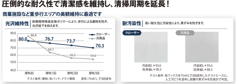 新開発特殊高反発ポリマーにより、歩行による磨耗を防ぎ、光沢低下を抑えます。